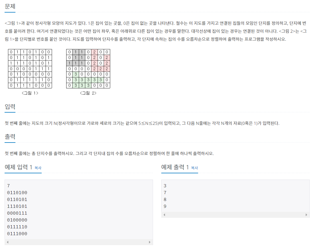 출력값에는 총 단지 수, 그리고 각 단지내 집 수를 오름차순으로 출력해야한다는것에 유의한다.