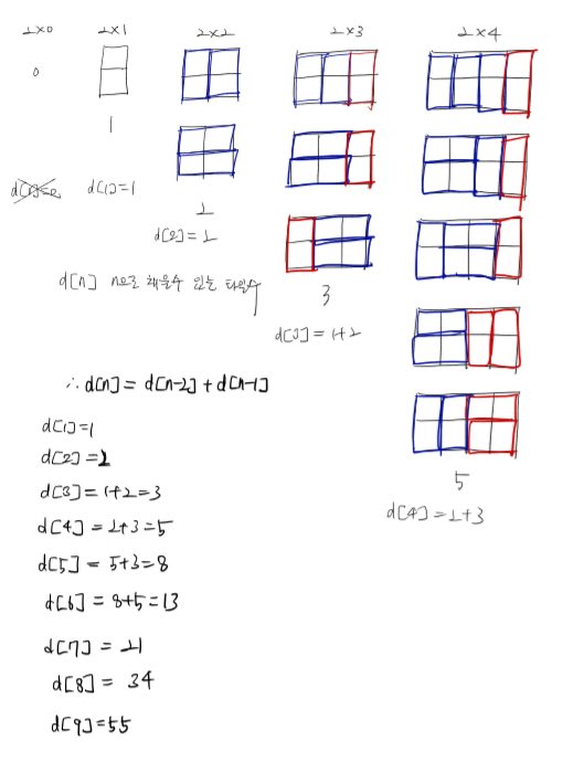 n=1일때부터 n=4일때까지 그려보고 d[n]=d[n-2]+d[n-1] 규칙을 찾을 수 있었다.