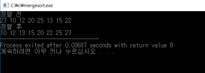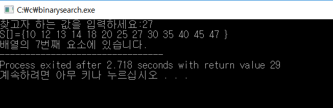정렬된 S에 x가 몇번째에 있는지 찾는 알고리즘 #include void main(){ int S[] = {10,12,13,14,18,20,25,27,30,35,40,45,47}; int x; printf("찾고자 하는 값을 입력하세요:"); scanf_s("%d", &x); int x_result; x_result = location(S, 0, sizeof(S)/sizeof(int)-1, x); if(x_result==-1){ printf("값이 없습니다."); }else{ printf("S[]={"); for(int i=0; ihigh){ return -1; } else{ mid=(low+high)/2; if(x==S[mid]){ return mid; } else if(x